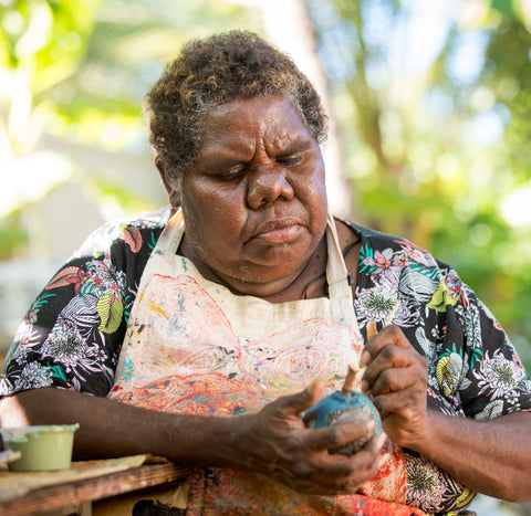 In 2012 I started working at Marnin Studio painting boab nuts and weaving baskets. I like painting because it makes me busy and it takes my mind off other things. The studio is comfortable and we can enjoy painting. I feel relaxed when I'm painting at the studio with all my friends. I feel good when I get paid for painting boab nuts. It's the right way, sharing and caring with everybody.